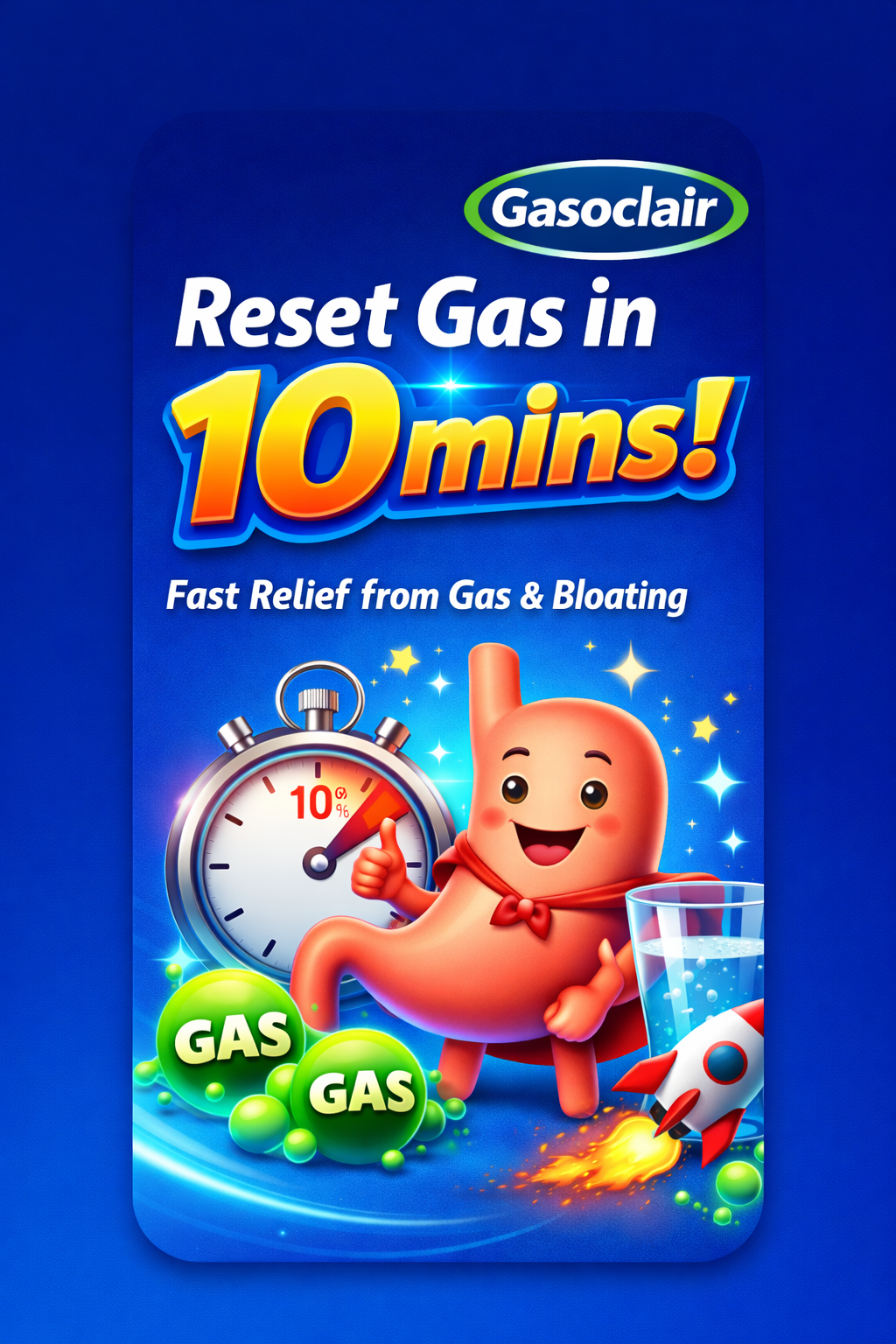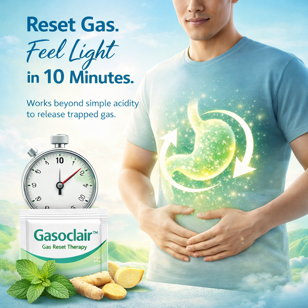 Why Gasoclair matters: It works beyond simple acidity to release trapped gas, calm your stomach, and restore gut balance, helping you feel lighter, more comfortable, and in control of your day.